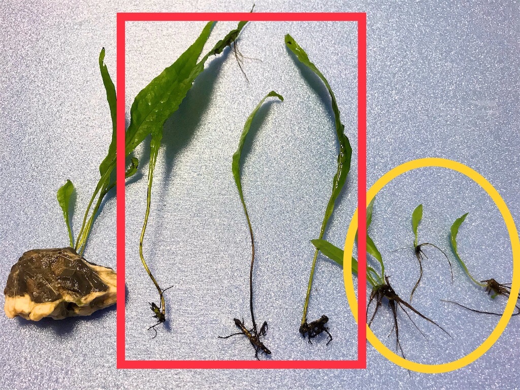 砂やソイルに植えると根茎の通水性の確保が出来ず枯れてしまう場合があるので、石や流木に活着させます。
