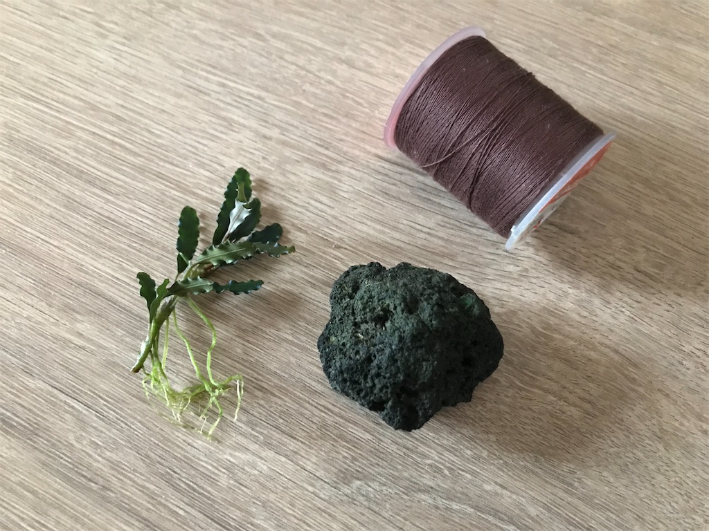 元から生えてる古い仮根はカットして、流木や石にモスコットンやテグスで巻きつけ活着させます。
