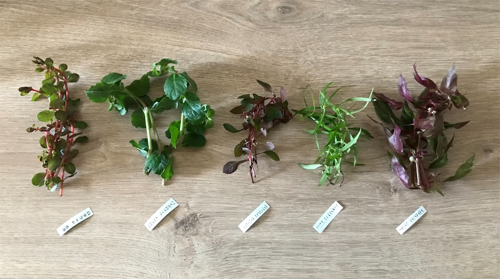赤系の水草が〝水上葉〟の状態で5種入っています。