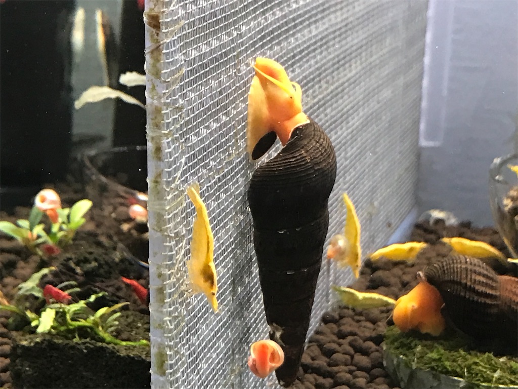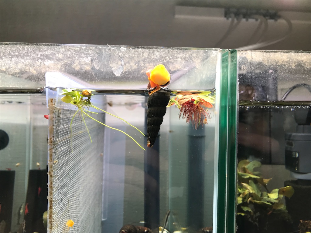 貝が細長く6cm程あるので動くスピードや水槽壁面を登れるのか不安がありましたが、思っていた以上に水槽壁面も登り色々な箇所の掃除をしてくれます。